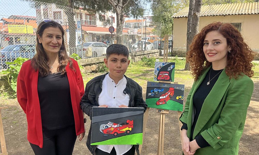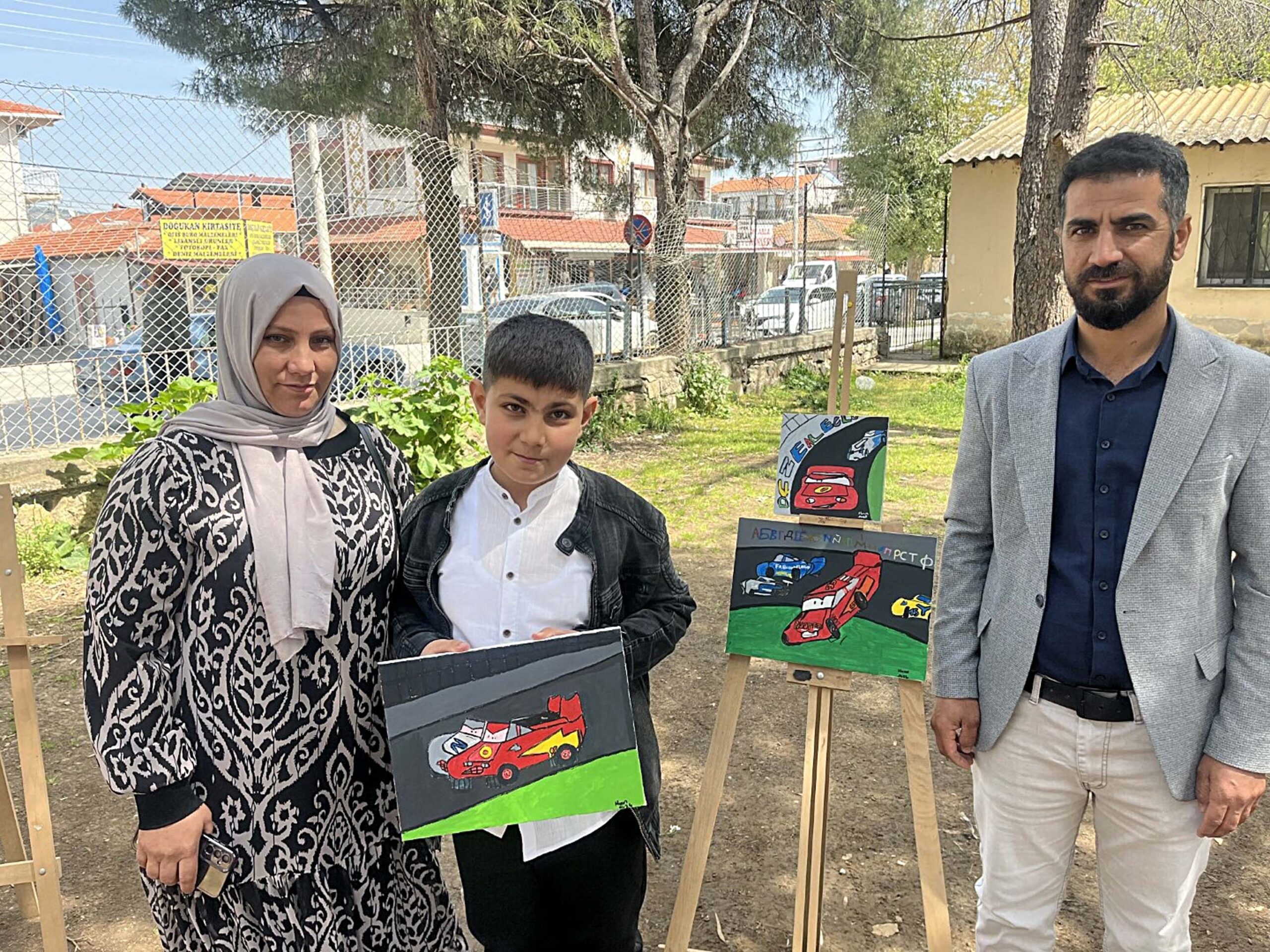 İzmir'de yaşayan otizmli 10 yaşındaki Hasan Hüseyin Yavuz'un (Ortada) çizimlerden oluşan 12 tuval, 12 resim kağıdı üzerine yaptığı 24 çalışma Bağarası Cemil Midilli İlkokulu bahçesinde sergilendi.Fotoğraf:Seza Nur ALPDÜNDAR/İzmir,(DHA)