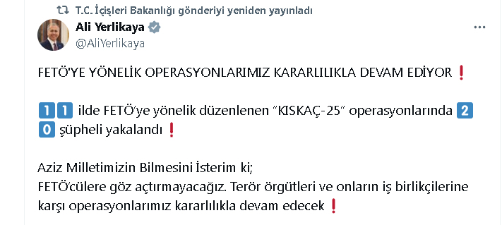Bakan Yerlikaya, sosyal medya hesabından yaptığı açıklamada, Emniyet Genel Müdürlüğü Terörle Mücadele Daire Başkanlığı, İstihbarat Başkanlığı ile Kaçakçılık ve Organize Suçlarla Mücadele Başkanlığı koordinesinde 11 ilde FETÖye yönelik Kıskaç-25 operasyonları düzenlendiğini belirtti. Buna göre; Adana, Ankara, Antalya, Çorum, Elazığ, İstanbul, İzmir, Ordu, Samsun, Kahramanmaraş ve Vanda düzenlenen eş zamanlı baskınlarda, örgütün sözde askeri mahrem yapılanmasında yer alan, ByLock kullanıcısı ve hakkında kesinleşmiş hapis cezası ile yakalama kararı bulunan 20 şüpheli yakalandı.