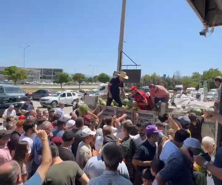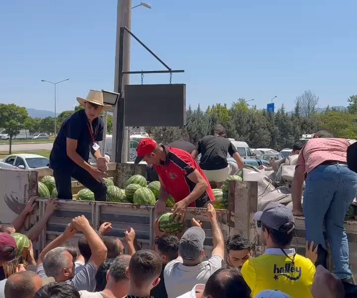 İnegöl-Alanyurt yolu üzerinde faaliyet gösteren mağaza yetkilileri, müşterilerine 12 ton ücretsiz karpuz dağıttı. Bir kamyon karpuzun ücretsiz dağıtılacağını duyanlar, mağazanın önüne akın etti. Kamyon kasasındaki karpuzlar 20 dakika içinde tükendi.