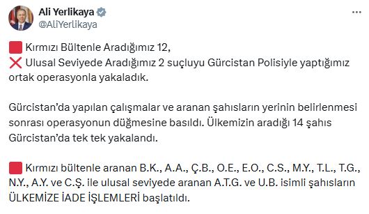 İçişleri Bakanı Ali Yerlikaya, yurt dışındaki firari suçluların yakalanmasına yönelik Emniyet Genel Müdürlüğü Interpol-Europol Daire Başkanlığı koordinesinde düzenlenen operasyonu sosyal medya hesabından paylaştı. Buna göre; Gürcistan polisi ile yapılan ortak çalışmalar sonucu kırmızı bültenle aranan B.K., A.A., Ç.B., O.E., E.O., C.S., M.Y., T.L., T.G., N.Y., A.Y. ve C.Ş. ile ulusal seviyede aranan A.T.G. ve U.B. yakalandı. Yurda iadeleri sağlanan 14 kişi, Suç örgütü üyeliği, Kasten öldürmeye teşebbüs, Dolandırıcılık, Nitelikli yağma, Yaralama, Tasarlayarak öldürme, Çocuğun cinsel istismarı, Hırsızlık Kasten öldürme gibi suçlardan aranıyordu.