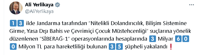 Bakan Yerlikaya, sosyal medya hesabından yaptığı açıklamada, Jandarma Genel Komutanlığı Siber Suçlarla Mücadele Daire Başkanlığı koordinesinde Nitelikli dolandırıcılık, Bilişim sistemine girme, Yasa dışı bahis ve Çevrimiçi çocuk müstehcenliği suçlarına yönelik Siberağ-1 operasyonları düzenlendiğini belirtti. Buna göre; Zonguldak, İstanbul, Adana ve Ankara merkezli toplam 13 ilde yapılan eş zamanlı baskınlarda, banka hesaplarında toplam 3 milyar 600 milyon TL para hareketliliği bulunan 35 şüpheli yakalandı. Operasyonlar sonucu çok sayıda ruhsatsız tabanca, dijital materyal ile döviz ve TL ele geçirildi.