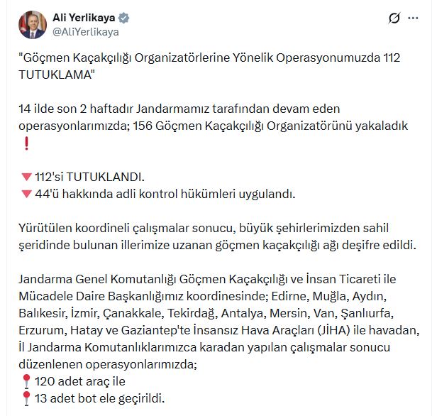 İçişleri Bakanı Ali Yerlikaya, jandarma tarafından son 2 haftadır düzenlenen operasyonları sosyal medya hesabından duyurdu. Buna göre; İl Jandarma Komutanlıklarınca yürütülen operasyonda 156 göçmen kaçakçılığı organizatörü yakalandı. Şüphelilerin 112si tutuklandı, 44ü hakkında adli kontrol hükümleri uygulandı. Operasyonda ayrıca 120 araç ile 13 bot ele geçirildi.