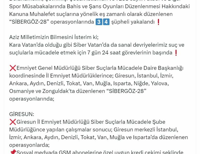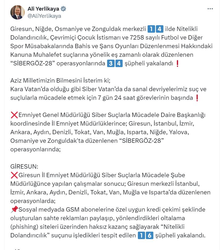 İÇİŞLERİ Bakanı Ali Yerlikaya, Giresun, Niğde, Osmaniye ve Zonguldak merkezli 14 ilde düzenlenen Sibergöz-28 operasyonlarında 34 şüphelinin yakalandığını duyurdu.Bakan Yerlikaya, sosyal medya hesabından yaptığı açıklamada, Emniyet Genel Müdürlüğü Siber Suçlarla Mücadele Daire Başkanlığı koordinesinde; Giresun, İstanbul, İzmir, Ankara, Aydın, Denizli, Tokat, Van, Muğla, Isparta, Niğde, Yalova, Osmaniye ve Zonguldakta eş zamanlı Sibergöz-28 operasyonları düzenlendiğini belirtti. Yerlikaya; Giresun merkezli 10 ilde düzenlenen operasyonlarda nitelikli dolandırıcılık suçunu işledikleri tespit edilen 16, Niğde merkezli 4 ilde düzenlenen operasyonlarda nitelikli dolandırıcılık suçunu işledikleri tespit edilen 12, Osmaniyede çevrim içi çocuk istismarı suçunu işledikleri tespit edilen 5 şüpheli ve Zonguldakta yasa dışı bahis reklamı yaptığı tespit edilen 1 şüphelinin yakalandığını ifade etti. Operasyonlar sonucu 1 otomobil, 32 bin dolar, çok miktarda altın ve Türk Lirası ile çok sayıda dijital materyale el konulduğunu kaydeden Bakan Yerlikaya, operasyonları gerçekleştiren polisleri tebrik etti.