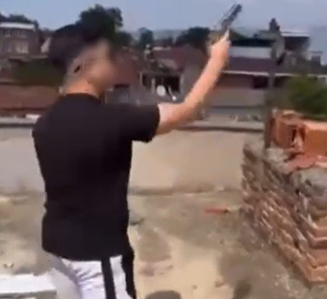 • Bursa'da Muhammed K. (14) (Fotoğrafta), elindeki tabancayla balkondan havaya ateş açtı. O anları cep telefonu kamerası ile kayıt altına aldıran çocuk, görüntüleri sosyal medyadan paylaşınca yakalanarak gözaltına alındı. Fotoğraf: Mustafakemalpaşa (Bursa),