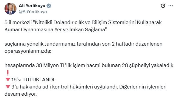 İçişleri Bakanı Ali Yerlikaya, jandarma tarafından son 2 haftadır düzenlenen operasyonu, sosyal medya hesabından paylaştı. Buna göre; Nitelikli dolandırıcılık ve Bilişim sistemlerini kullanarak kumar oynanmasına yer ve imkan sağlama suçlarına yönelik yapılan çalışmada, hesaplarında 38 milyon TLlik işlem hacmi bulunan 28 şüpheli yakalandı. Şüphelilerin 16sı tutuklanırken, 9u hakkında adli kontrol hükümleri uygulandı. Diğerlerinin işlemleri ise devam ediyor.