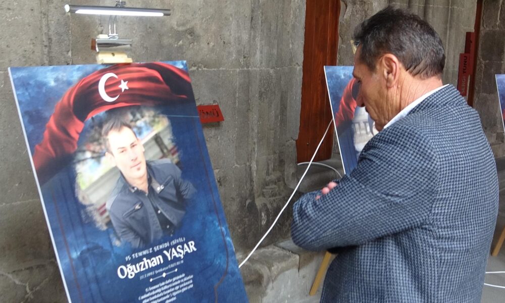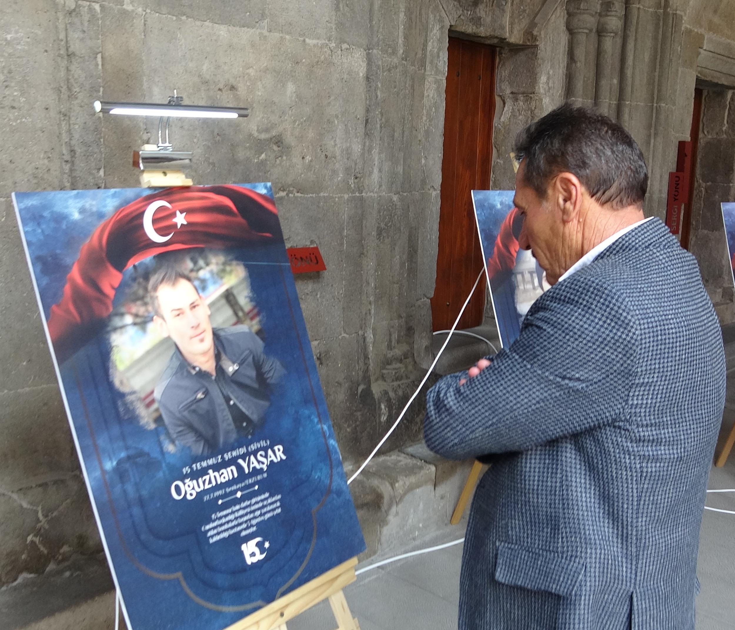 Darbe gecesi Cumhurbaşkanı Erdoğanın çağrısının ardından Külliye’de şehit olan Oğuzhan Yaşarın anne ve babası da sergide davetli olarak yer aldı. Gözyaşları içinde kalan anne Necmiye Yaşara (57) görevliler yardımcı olurken, 23 yaşındayken şehit olan oğlunun resminin yanında konuşan baba Ahmet Yaşar, “Oğlum, darbe gecesi yaralandıktan sonra 19 gün hastanede yattı. Beynine şarapnel parçası isabet etmişti. Tedavisinde son bir umut denediler ama olmadı. Beynimi vermek istedim. Bu da tıbben mümkün olmadı. Oğlumun alın yazısında öyleymiş. Rabbim sabrını veriyor” diye konuştu.