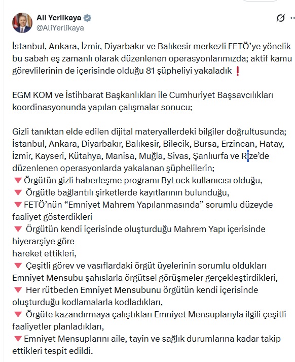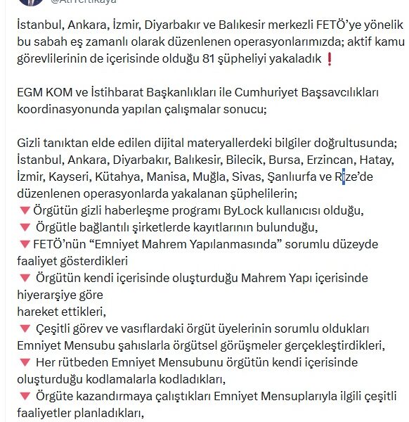 İçişleri Bakanı Yerlikayanın sanal medya hesabından yaptığı açıklamaya göre; gizli tanıktan elde edilen dijital materyallerdeki bilgiler doğrultusunda İstanbul, Ankara, Diyarbakır, Balıkesir, Bilecik, Bursa, Erzincan, Hatay, İzmir, Kayseri, Kütahya, Manisa, Muğla, Sivas, Şanlıurfa ve Rizede FETÖ’ye yönelik bu sabah eş zamanlı olarak düzenlenen operasyonlarda; aktif kamu görevlilerinin de içerisinde olduğu 81 şüpheli yakalandı. Şüphelilerin; örgütün gizli haberleşme programı ByLock kullanıcısı olduğu, örgütle bağlantılı şirketlerde kayıtlarının bulunduğu, FETÖnün emniyet mahrem yapılanmasında sorumlu düzeyde faaliyet gösterdikleri, örgütün kendi içerisinde oluşturduğu mahrem yapı içerisinde hiyerarşiye göre hareket ettikleri, çeşitli görev ve vasıflardaki örgüt üyelerinin sorumlu oldukları emniyet mensubu kişilerle örgütsel görüşmeler gerçekleştirdikleri, her rütbeden emniyet mensubunu örgütün kendi içerisinde oluşturduğu kodlamalarla kodladıkları, örgüte kazandırmaya çalıştıkları emniyet mensupları ile ilgili çeşitli faaliyetler planladıkları, emniyet mensuplarını aile, tayin ve sağlık durumlarına kadar takip ettikleri tespit edildi.