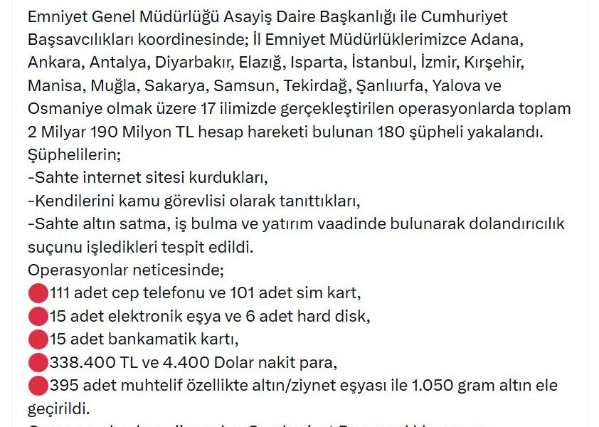 EGMden yapılan açıklamaya göre; Adana, Ankara, Antalya, Diyarbakır, Elazığ, Isparta, İstanbul, İzmir, Kırşehir, Manisa, Muğla, Sakarya, Samsun, Tekirdağ, Şanlıurfa, Yalova ve Osmaniye olmak üzere 17 ilde gerçekleştirilen operasyonda, toplam 2 milyar 190 milyon TL hesap hareketi bulunan 180 şüpheli yakalandı. Şüphelilerin; sahte internet sitesi kurdukları, kendilerini kamu görevlisi olarak tanıttıkları, sahte altın satma, iş bulma ve yatırım vaadinde bulunarak dolandırıcılık suçunu işledikleri tespit edildi. Operasyonlar sonucunda; 111 cep telefonu ve 101 sim kart, 15 elektronik eşya ve 6 hard disk, 15 ATM kartı, 338 bin 400 TL ve 4 bin 400 dolar nakit para, 395 muhtelif özellikte altın/ziynet eşyası ile 1050 gram altın ele geçirildi.