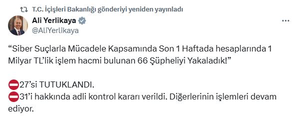 İçişleri Bakanı Ali Yerlikaya, 9 il merkezli Yasa dışı bahis, Nitelikli dolandırıcılık ve Nitelikli hırsızlık suçlarına yönelik jandarma tarafından düzenlenen operasyonu sosyal medya hesabından paylaştı. Buna göre; toplam 19 ilde son bir haftada yürütülen operasyonda hesaplarında 1 milyar TLlik işlem hacmi bulunan 66 şüpheli yakalandı. Şüphelilerin yasa dışı bahis siteleri üzerinden haksız kazanç sağladıkları, araç satışı ilanları ile dolandırıcılık yaptıkları belirlendi. Mağdurların mobil bankacılık bilgilerini ele geçirerek hesaplardan para çektikleri, Yatırım danışmanlığı ve faturalı hat yardımı adı altında kimlik bilgisi ve şifre elde edip nitelikli hırsızlık yaptıkları tespit edildi. Ayrıca, isimlerinin terör soruşturmasına karıştığını söyleyip mağdurlardan yüklü miktarda para transferi yaptırdıkları tespit edildi. Haklarında soruşturma başlatılan şüphelilerin 27si tutuklandı, 31i hakkında adli kontrol kararı verildi. Diğerlerinin işlemleri devam ediyor.