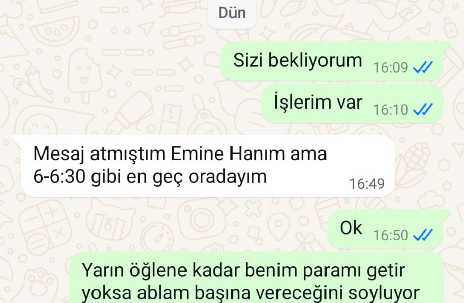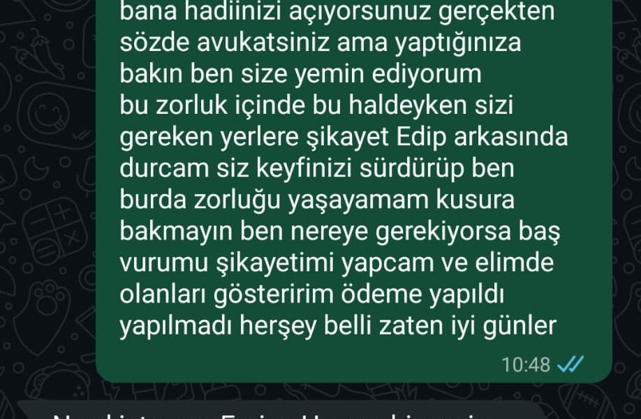 Avukatla yeniden iletişime geçtiğini anlatan Polat, “Telefonla konuştuğumuzda parayı aldığını söyledi. Yüz yüze görüşmemiz gerektiğini belirtti. Görüşmede parayı başka bir yerde kullandığını, daha sonra bana vereceğini söyledi. Acil ihtiyacım olduğunu bildiği halde ödeme yapmadı. Şikayetçi olacağımı söylediğimde ise İstediğin yere şikayet edebilirsin dedi” diye konuştu. Avukatın bugüne kadar yalnızca küçük miktarlarda yaklaşık 88 bin TL ödeme yaptığını, hala ödemesi gereken büyük bir miktar kaldığını söyleyen Polat, “2 yıl boyunca bana sadece 2 bin, 5 bin, 10 bin lira gibi ödemeler yaptı. Onları da yalvara yalvara aldım. Kendimi dilenci gibi hissettim” dedi.