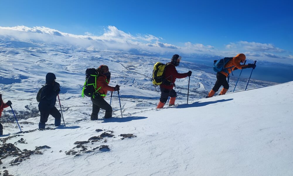 Van'da Vadi Doğa Sporları Arama Kurtarma Spor Kulübü üyesi 18 dağcı, kar yağışı sonrası 2 bin 800 rakımlı Küçük Erek Dağı'na zorlu bir tırmanış gerçekleştirdi.Fotoğraf: Van,(DHA)