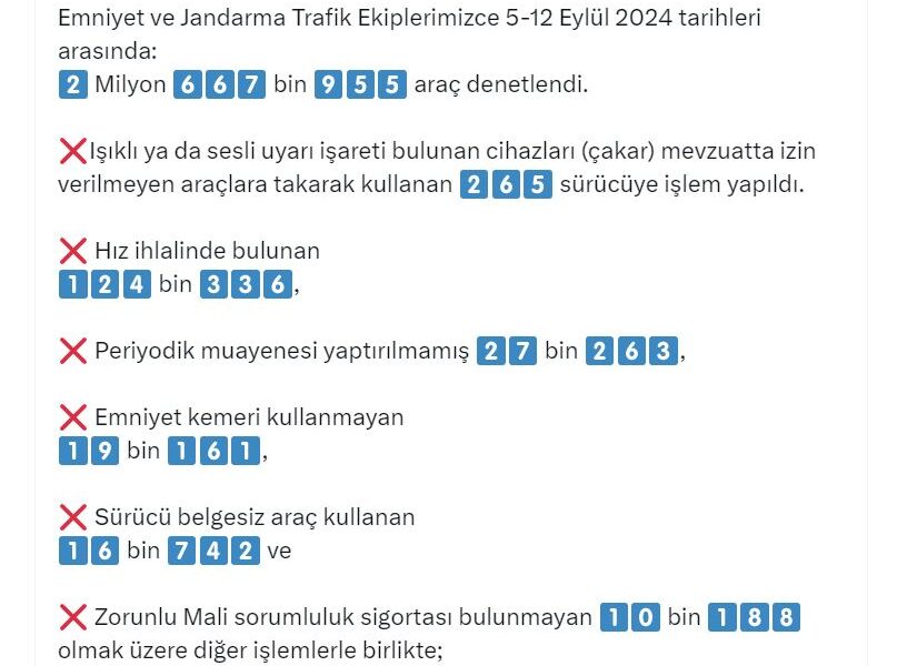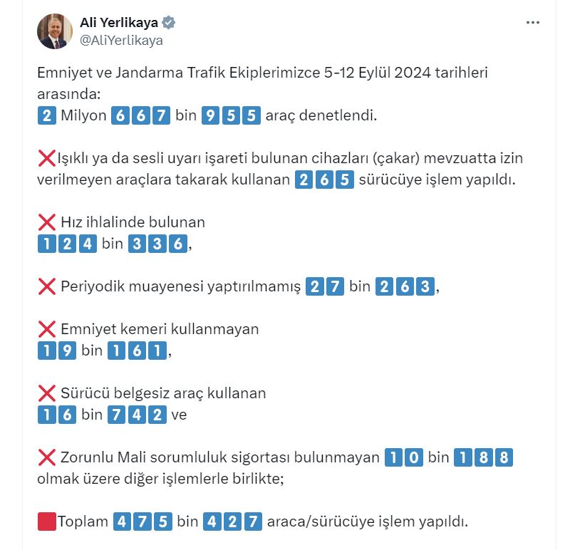 Bakan Yerlikaya, sosyal medya hesabından yaptığı açıklamada, “Emniyet ve jandarma trafik ekiplerimizce 5-12 Eylül 2024 tarihleri arasında 2 milyon 667 bin 955 araç denetlendi. Işıklı ya da sesli uyarı işareti bulunan cihazları (çakar) mevzuatta izin verilmeyen araçlara takarak kullanan 265 sürücüye işlem yapıldı. Hız ihlalinde bulunan 124 bin 336, periyodik muayenesi yaptırılmamış 27 bin 263, emniyet kemeri kullanmayan 19 bin 161, sürücü belgesiz araç kullanan 16 bin 742 ve zorunlu mali sorumluluk sigortası bulunmayan 10 bin 188 olmak üzere diğer işlemlerle birlikte; toplam 475 bin 427 araca/sürücüye işlem yapıldı” dedi.