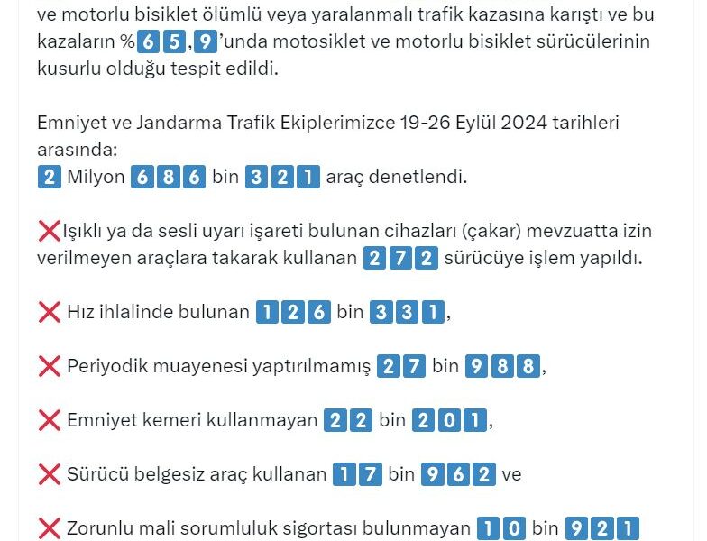 Bakan Yerlikaya, sosyal medya hesabından yaptığı açıklamada, “Emniyet ve jandarma trafik ekiplerimizce 19-26 Eylül 2024 tarihleri arasında 2 milyon 686 bin 321 araç denetlendi. Işıklı ya da sesli uyarı işareti bulunan cihazları (çakar) mevzuatta izin verilmeyen araçlara takarak kullanan 272 sürücüye işlem yapıldı. Hız ihlalinde bulunan 126 bin 331, periyodik muayenesi yaptırılmamış 27 bin 988, emniyet kemeri kullanmayan 22 bin 201, sürücü belgesiz araç kullanan 17 bin 962 ve zorunlu mali sorumluluk sigortası bulunmayan 10 bin 921 olmak üzere diğer işlemlerle birlikte; toplam 474 bin 317 araca/sürücüye işlem yapıldı” dedi.