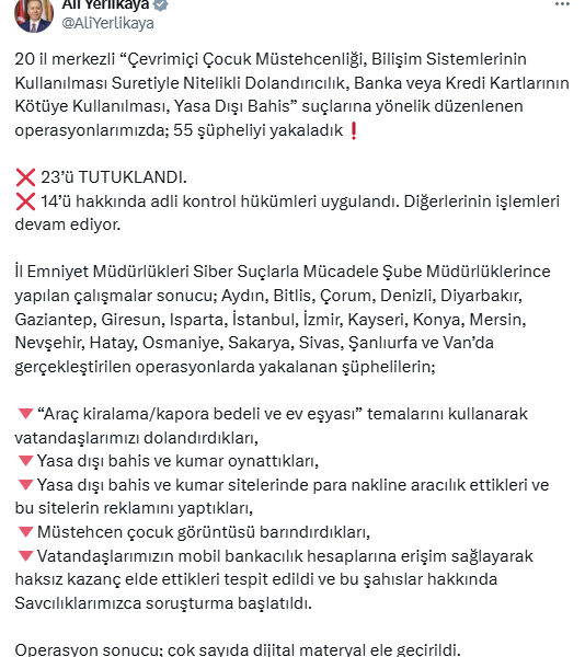 İçişleri Bakanı Ali Yerlikaya, Emniyet Genel Müdürlüğü koordinesinde düzenlenen operasyonu, sosyal medya hesabından paylaştı. Buna göre; 20 ilde Çevrim içi çocuk müstehcenliği, Bilişim sistemlerinin kullanılması suretiyle nitelikli dolandırıcılık, Banka veya kredi kartlarının kötüye kullanılması, Yasa dışı bahis suçlarına yönelik düzenlenen operasyonda 55 şüpheli yakalandı. Operasyon sonucu çok sayıda dijital materyal ele geçirildi. Yakalanan şüphelilerden, 23ü tutuklandı, 14ü hakkında adli kontrol hükümleri uygulandı. Diğerlerinin işlemleri devam ediyor.