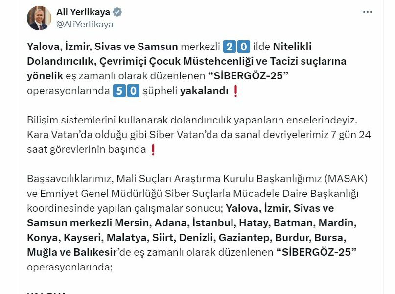 İÇİŞLERİ Bakanı Ali Yerlikaya, Yalova, İzmir, Sivas ve Samsun merkezli 20 ilde nitelikli dolandırıcılık, çevrimiçi çocuk müstehcenliği ve tacizi suçlarına yönelik eş zamanlı düzenlenen Sibergöz-25 operasyonlarında 50 şüphelinin yakalandığını duyurdu.Bakan Yerlikaya, sosyal medya hesabından yapılan açıklamada, Başsavcılıklar, Mali Suçları Araştırma Kurulu Başkanlığı (MASAK) ve Emniyet Genel Müdürlüğü Siber Suçlarla Mücadele Daire Başkanlığı koordinesinde yapılan çalışmalar sonucu; Yalova, İzmir, Sivas ve Samsun merkezli Mersin, Adana, İstanbul, Hatay, Batman, Mardin, Konya, Kayseri, Malatya, Siirt, Denizli, Gaziantep, Burdur, Bursa, Muğla ve Balıkesirde eş zamanlı Sibergöz-25 operasyonları düzenlendiğini belirtti.DOLANDIRICILIK YAPANLARIN ESNELERİNDEYİZYerlikaya, nitelikli dolandırıcılık, çevrim içi çocuk müstehcenliği ve tacizi suçlarına yönelik düzenlenen operasyonlarda 50 şüphelinin yakalandığını ifade ederek, “Bilişim sistemlerini kullanarak dolandırıcılık yapanların enselerindeyiz. Kara vatanda olduğu gibi siber vatanda da sanal devriyelerimiz 7 gün 24 saat görevlerinin başında. Başsavcılıklarımızı, MASAKı ve operasyonları gerçekleştiren kahraman polislerimizi tebrik ediyorum. Allah ayaklarına taş değdirmesin. Milletimizin duası sizinle” dedi.