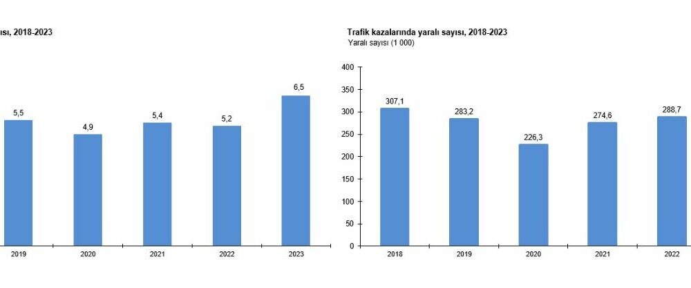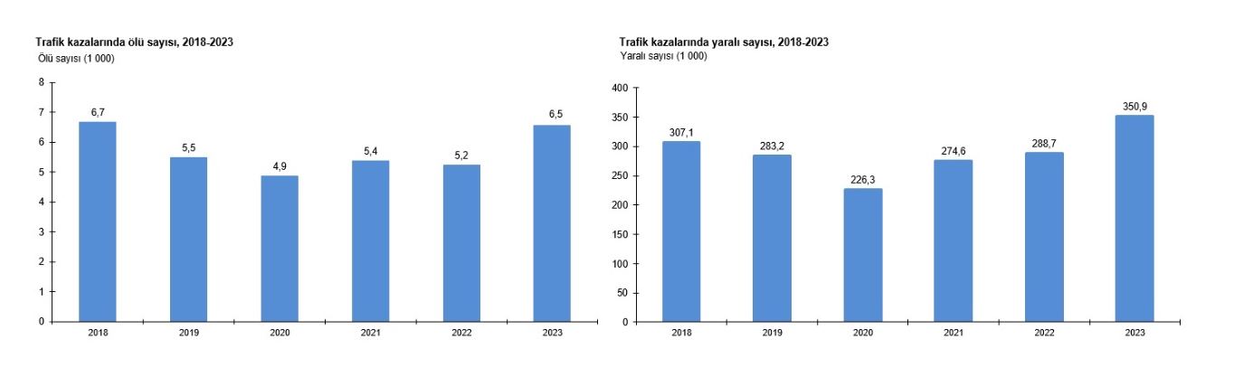 Türkiyede 2023 yılında bir önceki yıla göre trafikteki motorlu kara taşıtı sayısı yüzde 8,5 artarken, toplam kaza sayısı yüzde 6,6, ölümlü yaralanmalı kaza sayısı yüzde 19,2, maddi hasarlı kaza sayısı yüzde 4,2, toplam ölü sayısı yüzde 25,2 ve yaralı sayısı yüzde 21,5 arttı.