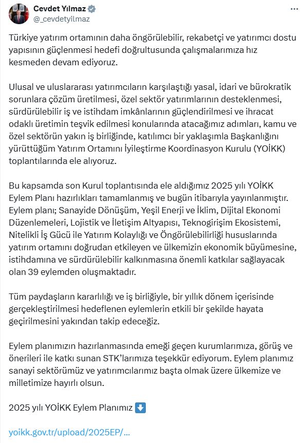 Cumhurbaşkanı Yardımcısı Cevdet Yılmaz, sosyal medya hesabından yaptığı açıklamada, Türkiyenin yatırım ortamının daha öngörülebilir, rekabetçi ve yatırımcı dostu yapısının güçlenmesi hedefi doğrultusunda çalışmalarına hız kesmeden devam ettiklerini kaydederek, “Ulusal ve uluslararası yatırımcıların karşılaştığı yasal, idari ve bürokratik sorunlara çözüm üretilmesi, özel sektör yatırımlarının desteklenmesi, sürdürülebilir iş ve istihdam imkanlarının güçlendirilmesi ve ihracat odaklı üretimin teşvik edilmesi konularında atacağımız adımları, kamu ve özel sektörün yakın iş birliğinde, katılımcı bir yaklaşımla Başkanlığını yürüttüğüm Yatırım Ortamını İyileştirme Koordinasyon Kurulu toplantılarında ele alıyoruz. Bu kapsamda son Kurul toplantısında ele aldığımız 2025 yılı YOİKK Eylem Planı hazırlıkları tamamlanmış ve bugün itibarıyla yayınlanmıştır” dedi.