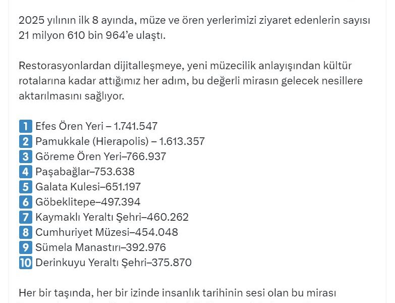 Bakan Ersoyun paylaşımına göre; yılın ilk 8 ayında Efes Ören Yerini 1 milyon 741 bin 547 kişi, Pamukkaleyi (Hierapolis) 1 milyon 613 bin 357 kişi, Göreme Ören Yerini 766 bin 937 kişi, Paşabağlar Ören Yerini 753 bin 638 kişi, Galata Kulesini 651 bin 197 kişi, Göbeklitepeyi 497 bin 394 kişi, Kaymaklı Yeraltı Şehrini 460 bin 262 kişi, Cumhuriyet Müzesini 454 bin 48 kişi, Sümela Manastırını 392 bin 976 kişi, Derinkuyu Yeraltı Şehrini ise 375 bin 870 kişi ziyaret etti.