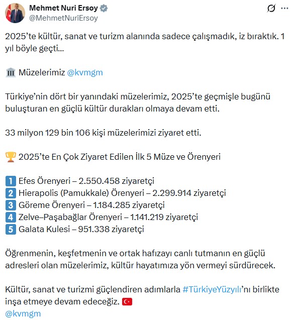 Bakan Ersoy, 2025 yılında müze ve örenyerlerini 33 milyon 129 bin 106 kişinin ziyaret ettiğini, Efes Örenyerinin 2 milyon 550 bin 458, Hierapolis (Pamukkale) Örenyerinin 2 milyon 299 bin 914, Göreme Örenyerinin 1 milyon 184 bin 285, Zelve–Paşabağlar Örenyerinin 1 milyon 141 bin 219, Galata Kulesinin 951 bin 338 ziyaretçi ile en çok ziyaret edilen yerler olduğunu duyurdu.