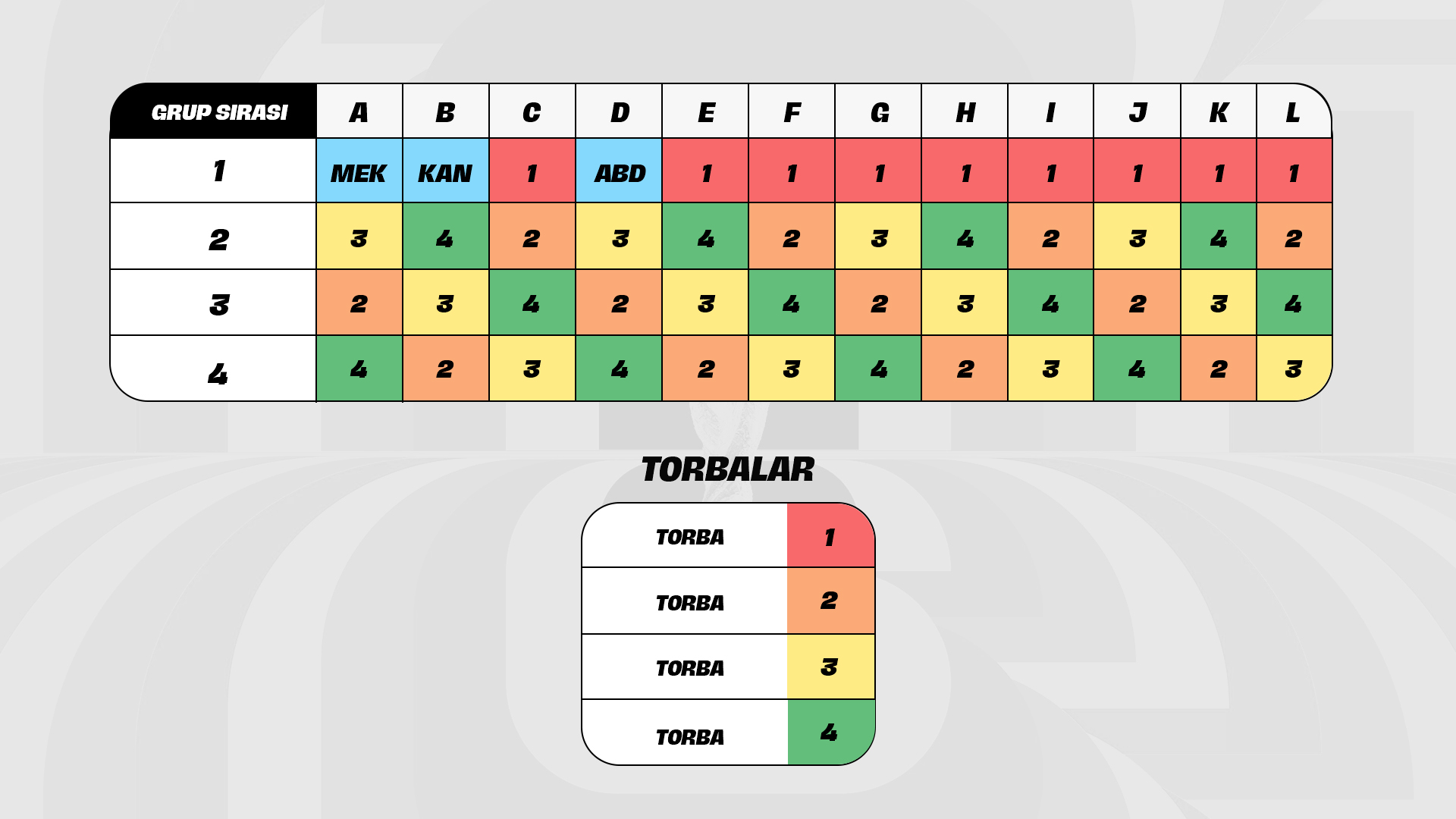 -2, 3 ve 4üncü Torbadaki takımlar, çekiliş sıralarına istinaden özel olarak belirlenmiş bir dizilime göre gruplara yerleştirilecektir.
