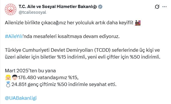 Bakanlığın sosyal medya hesabından yapılan açıklamada, “Ailenizle birlikte çıkacağınız her yolculuk artık daha keyifli. Aile Yılında mesafeleri kısaltmaya devam ediyoruz. Türkiye Cumhuriyeti Devlet Demiryolları (TCDD) seferlerinde üç kişi ve üzeri aileler için biletler yüzde 15 indirimli, yeni evli çiftler için yüzde 50 indirimli. Mart 2025ten bu yana 176 bin 480 vatandaşımız yüzde 15, 24 bin 851 genç çiftimiz yüzde 50 indirimle seyahat etti” denildi.