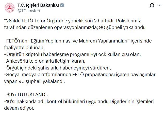 Bakanlığın sanal medya hesabından yapılan açıklamaya göre; 26 ilde FETÖ terör örgütüne yönelik son 2 haftadır polis tarafından düzenlenen operasyonlarda 90 şüpheli yakalandı. Şüphelilerin FETÖ’nün Eğitim yapılanması ve Mahrem yapılanmaları içerisinde faaliyette bulundukları, ByLock kullanıcısı oldukları, ankesörlü telefonlarla iletişim kurdukları, örgüt içindeki şüphelilerle haberleşmeyi sürdürdükleri ve sanal medya platformlarında FETÖ propagandası içeren paylaşımlar yaptıkları belirlendi.