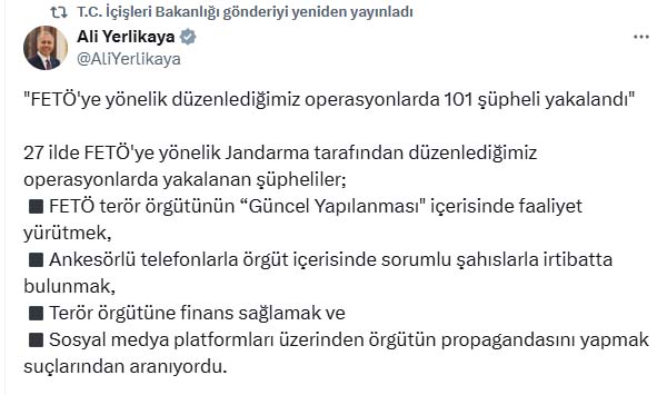 İçişleri Bakanı Yerlikayanın sosyal medya hesabından yaptığı açıklamaya göre; Cumhuriyet başsavcılıkları ile Jandarma Genel Komutanlığı koordinesinde 27 ilde FETÖye yönelik operasyonlar düzenlendi. 101 şüphelinin yakalandığı operasyonlarda, çok sayıda örgütsel doküman ve dijital materyal ele geçirildi. Şüpheliler; FETÖnün güncel yapılanması içerisinde faaliyet yürütmek, ankesörlü telefonlarla örgüt sorumluları ile irtibatta bulunmak, terör örgütüne finans sağlamak ve sosyal medya üzerinden örgütün propagandasını yapmak suçlarından aranıyordu.