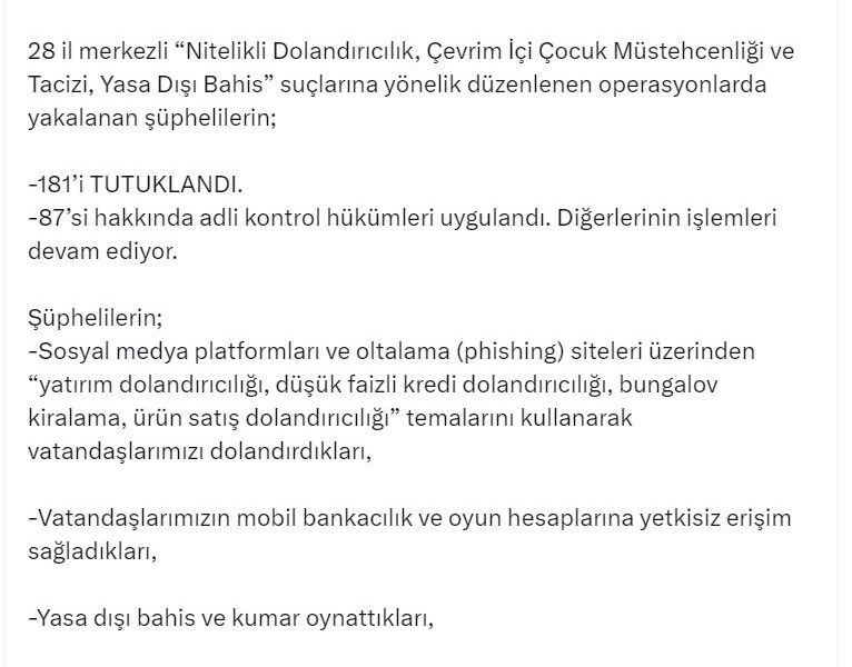 “Şüphelilerin; sosyal medya platformları ve oltalama (phishing) siteleri üzerinden yatırım dolandırıcılığı, düşük faizli kredi dolandırıcılığı, bungalov kiralama, ürün satış dolandırıcılığı temalarını kullanarak vatandaşlarımızı dolandırdıkları, vatandaşlarımızın mobil bankacılık ve oyun hesaplarına yetkisiz erişim sağladıkları, yasa dışı bahis ve kumar oynattıkları, yasa dışı bahis sitelerinde para nakline aracılık ettikleri ve reklamını yaptıkları, POS tefeciliği yaptıkları, müstehcen çocuk görüntüsü barındırdıkları, kişisel verilerin paylaşımı ve sorgulama konularında paylaşımlar yaptıkları tespit edildi. Operasyonlar sonucu şüphelilere ait suçtan elde edildiği değerlendirilen; 3 adet şirket, 1 adet futbol kulübü, 11 adet araç, 3 adet motosiklet, 7 adet daire, 6 adet arsa ve 1 adet iş yeri olmak üzere yaklaşık 210 milyon TL değerinde mal varlığına el konuldu. Siber suç ve suçlularla mücadelemiz kararlılıkla devam edecektir. Emeği geçenleri tebrik ediyoruz.”