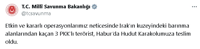 Milli Savunma Bakanlığının sosyal medya hesabından yapılan açıklamada, “Etkin ve kararlı operasyonlarımız neticesinde Irak’ın kuzeyindeki barınma alanlarından kaçan 3 PKK’lı terörist, Habur’da Hudut Karakolumuza teslim oldu” ifadelerine yer verildi.