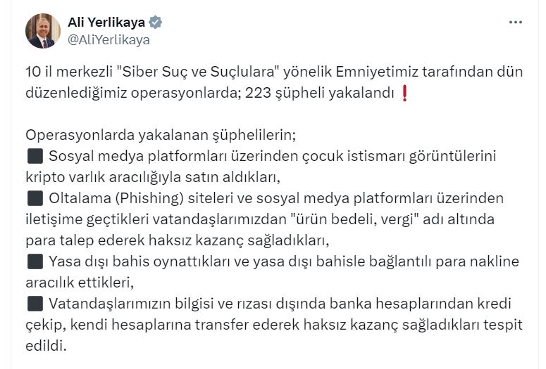Bakan Yerlikaya, sosyal medya hesabından yaptığı açıklamada, cumhuriyet başsavcılıkları ile Emniyet Genel Müdürlüğü Siber Suçlarla Mücadele Daire Başkanlığı koordinesinde, dün siber suç ve suçlulara yönelik 10 il merkezli 31 ilde düzenlenen operasyonlarda 223 şüphelinin yakalandığını belirtti. Yerlikaya, “Operasyonlarda yakalanan şüphelilerin; sosyal medya platformları üzerinden çocuk istismarı görüntülerini kripto varlık aracılığıyla satın aldıkları, oltalama (phishing) siteleri ve sosyal medya platformları üzerinden iletişime geçtikleri vatandaşlarımızdan ürün bedeli, vergi adı altında para talep ederek haksız kazanç sağladıkları, yasa dışı bahis oynattıkları ve yasa dışı bahisle bağlantılı para nakline aracılık ettikleri, vatandaşlarımızın bilgisi ve rızası dışında banka hesaplarından kredi çekip, kendi hesaplarına transfer ederek haksız kazanç sağladıkları tespit edildi” dedi.