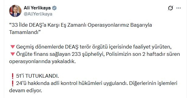 İçişleri Bakanı Ali Yerlikaya, polis tarafından düzenlenen operasyonu sosyal medya hesabından paylaştı. Buna göre; 33 ilde son 2 haftada düzenlenen operasyonda geçmiş dönemlerde DEAŞ terör örgütü içerisinde faaliyet yürüten ve örgüte finans sağladığı belirlenen 233 şüpheli yakalandı. Şüphelilerden 51i çıkarıldıkları hakimliklerce tutuklandı, 24ü hakkında adli kontrol hükümleri uygulandı. Diğerlerinin işlemleri devam ediyor.