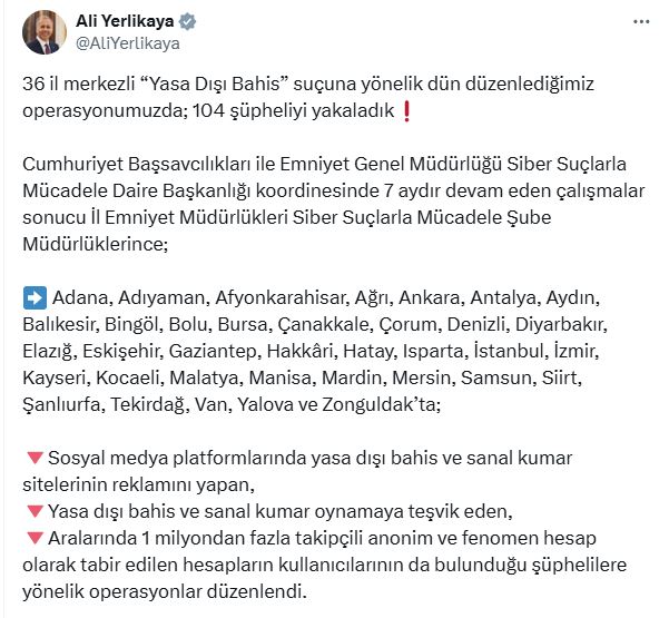 İçişleri Bakanı Ali Yerlikaya, Emniyet Genel Müdürlüğü koordinesinde Yasa dışı bahis suçuna yönelik gerçekleştirilen operasyonu sosyal medya hesabından paylaştı. Buna göre; 7 aydır süren çalışmalar sonucu sosyal medyada yasa dışı bahis ve sanal kumar sitelerinin reklamını yapan, yasa dışı bahis ve sanal kumar oynamaya teşvik eden, aralarında 1 milyondan fazla takipçili anonim ve fenomen hesap olarak tabir edilen hesapların kullanıcılarının da bulunduğu şüphelilere yönelik dün 36 il merkezli operasyon düzenlendi. Operasyon sonucu 104 şüpheli yakalanırken, çok sayıda dijital materyal ele geçirildi.