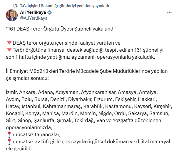 İçişleri Bakanı Ali Yerlikaya, DEAŞ terör örgütüne yönelik polis tarafından son bir haftada düzenlenen operasyonları sosyal medya hesabından paylaştı. Buna göre; terör örgütü içerisinde faaliyet yürüten ve örgüte finansal destek sağladığı tespit edilen 161 şüpheli, 38 ilde gerçekleştirilen eş zamanlı operasyonlarla yakalandı. Operasyonlarda ruhsatsız tabancalar, ruhsatsız av tüfeği ile çok sayıda örgütsel doküman ve dijital materyal ele geçirildi.