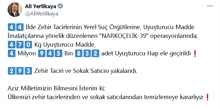 Bakan Yerlikaya, sosyal medya hesabından yaptığı açıklamada, Emniyet Genel Müdürlüğü Narkotik Suçlarla Mücadele Başkanlığı koordinesinde uyuşturucu imalat ve satışına yönelik 44 ilde Narkoçelik-39 operasyonları düzenlendiğini belirtti. Buna göre; 681 ekip ve 1876 personelin katıldığı operasyonlarda 9 hava aracı, 26 narkotik köpeği görev aldı. Yapılan eş zamanlı baskınlar ile yol kontrolleri sonucu 470 kilogram uyuşturucu madde, 4 milyon 945 bin 832 uyuşturucu hap ele geçirildi, 293 şüpheli yakalandı.