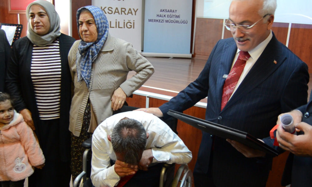 15 Temmuz Milli İrade Meydanında tekerlekli sandalyesiyle tespih satan Cumali Çağlayan, karşılaştığı Aksaray Valisi Mehmet Ali Kumbuzoğlu’a okuma-yazma öğrenmeyi istediğini söyledi. Vali Kumbuzoğlunun girişimleriyle Halk Eğitim Merkezinde düzenlenen okuma-yazma kursuna katıldı. 2 ay süren kurs sonunda okuyup yazmayı öğrenen Çağlayan, bugün düzenlenen törenle okuryazar belgesini aldı. Belgeyi alırken gözyaşlarını tutamayan Çağlayan, Okuma yazma öğrenmek isteğimi Vali Beye söyledim. O da benim elinden tuttu. Ben de 2 ay boyuncu azimli olarak Halk Eğitim Merkezindeki kursa giderek okuma- yazma öğrendim. Şimdiki hayalim ise yürümek ve bununu için gayret edeceğim” dedi.