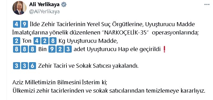 Bakan Yerlikaya, sosyal medya hesabından yaptığı açıklamada, Emniyet Genel Müdürlüğü Narkotik Suçlarla Mücadele Başkanlığı koordinesinde 49 ile uyuşturucu madde imalat ve satışına yönelik Narkoçelik-35 operasyonları düzenlendiğini belirtti. Buna göre; 832 ekip, 2 bin 81 personelin katılımıyla, 10 hava aracı ve 39 narkotik dedektör köpeğinin kullanıldığı operasyonlarda, 336 şüpheli yakalandı, 2 ton 428 kilogram uyuşturucu madde, 888 bin 923 uyuşturucu hap ele geçirildi.