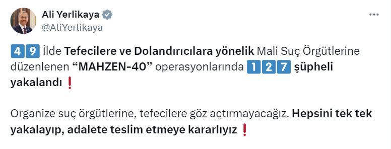 Bakan Yerlikaya, sosyal medya hesabından yaptığı açıklamada, “Emniyet Genel Müdürlüğü Kaçakçılık ve Organize Suçlarla Mücadele (KOM) Başkanlığı koordinesinde; İl Emniyet Müdürlükleri KOM ve Mali Şube Müdürlüklerince, 49 ilde Mahzen-40 operasyonları düzenlendi. Tefecilere ve dolandırıcılara yönelik operasyonlarda 127 şüpheli yakalandı. Operasyonlarda şüphelilerin; tefecilik, kamu kurum ve kuruşlarının zararına yönelik nitelikli dolandırıcılık, kişilere karşı nitelikli dolandırıcılık, ihaleye fesat karıştırma, resmi belgede sahtecilik ve Vergi Usul Kanununa muhalefet suçlarını işledikleri tespit edildi” dedi.