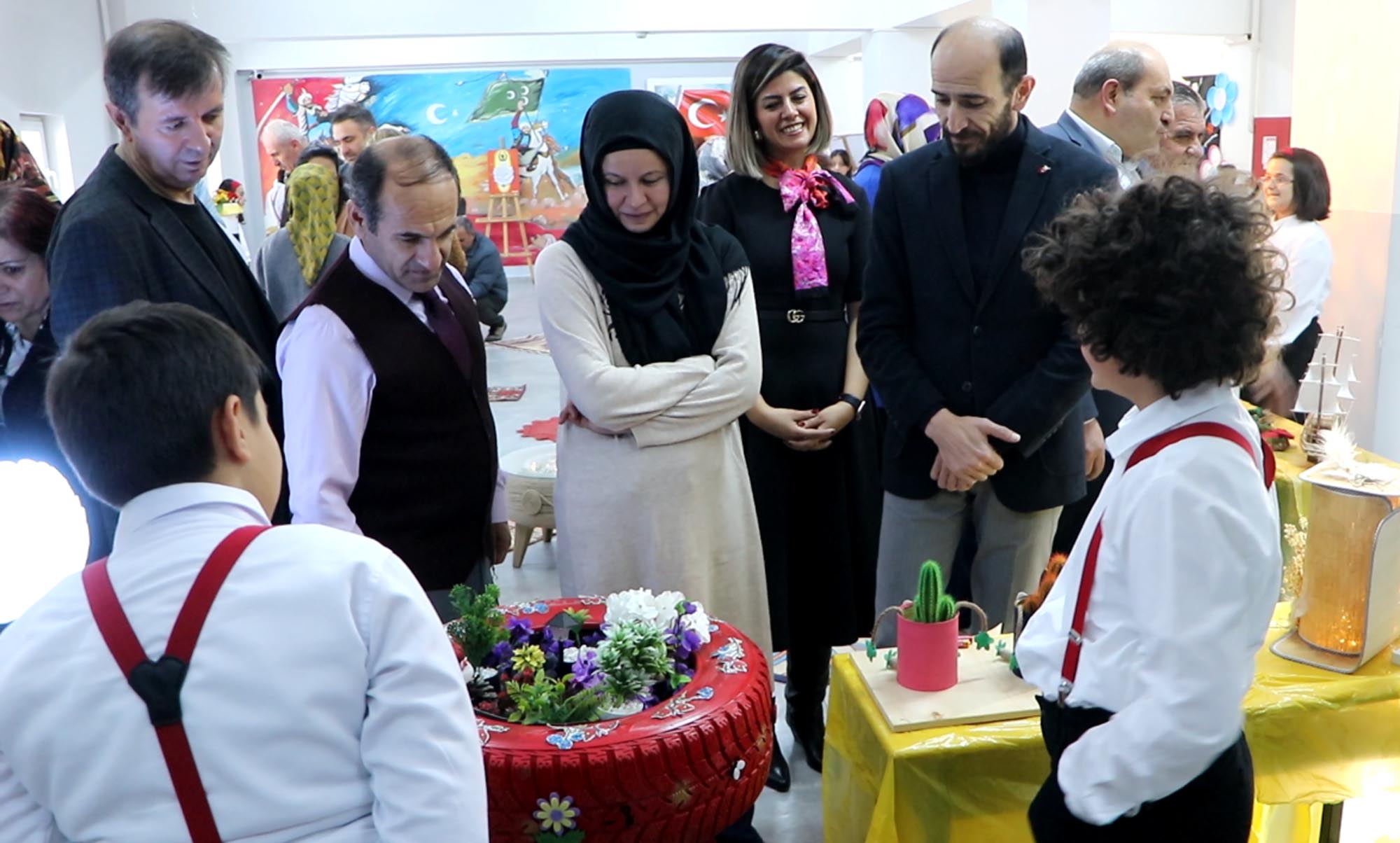 • Erzurum Kültür Kurumu İlkokulu 4'üncü sınıf öğrencileri, atıkları geri dönüştürdü. Pet bardakların kardan adam, lavabo borularının bisiklet, kravatların mutfak önlüğüne dönüştüğü sergi ilgi gördü. Fotoğraf: Salih TEKİN / Erzurum,(DHA)