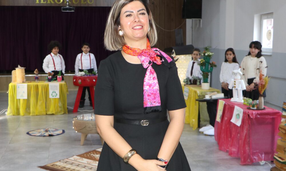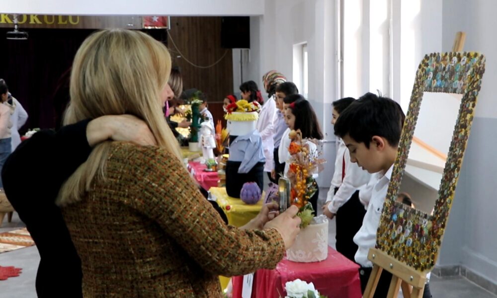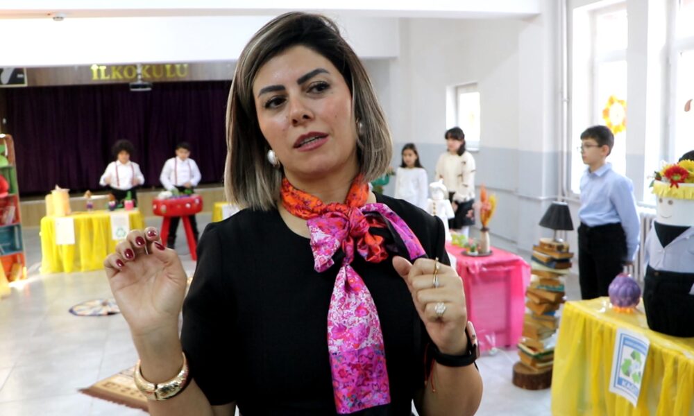 • Kültür Kurumu İlkokulu 4C sınıfı öğretmeni Güzide Zereybilek Yıldırım (Fotoğraftaki), çocukları çevre konusunda bilinçlendirmek için geri dönüşüm projesini hazırladıklarını söyledi. Fotoğraf: Salih TEKİN / Erzurum,(DHA)