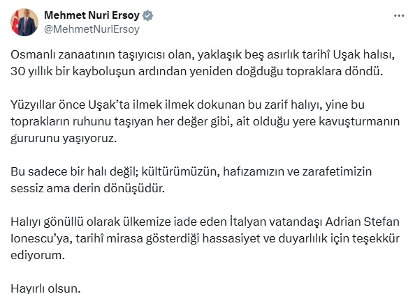 Bakan Ersoy, sosyal medya hesabından yaptığı açıklamada, “Osmanlı zanaatının taşıyıcısı olan, yaklaşık 5 asırlık tarihi Uşak halısı, 30 yıllık bir kayboluşun ardından yeniden doğduğu topraklara döndü. Yüzyıllar önce Uşak’ta ilmek ilmek dokunan bu zarif halıyı, yine bu toprakların ruhunu taşıyan her değer gibi, ait olduğu yere kavuşturmanın gururunu yaşıyoruz. Bu sadece bir halı değil; kültürümüzün, hafızamızın ve zarafetimizin sessiz ama derin dönüşüdür. Halıyı gönüllü olarak ülkemize iade eden İtalyan vatandaşı Adrian Stefan Ionescu’ya, tarihi mirasa gösterdiği hassasiyet ve duyarlılık için teşekkür ediyorum. Hayırlı olsun” dedi.