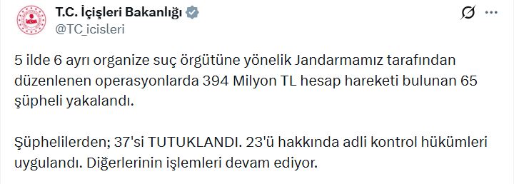 Bakanlığın sanal medya hesabından yapılan açıklamaya göre; jandarma ekipleri, 5 ilde 6 ayrı organize suç örgütüne yönelik operasyon düzenledi. Operasyonlarda, 394 milyon TL hesap hareketi bulunan 65 şüpheli yakalandı. Şüphelilerin adreslerinde çok sayıda dijital materyal, muhtelif miktarda nakit para ve doküman ele geçirildi. Adliyeye sevk edilen şüphelilerden 37si tutuklandı, 23ü hakkında adli kontrol hükümleri uygulandı. Diğerlerinin işlemleri ise devam ediyor.