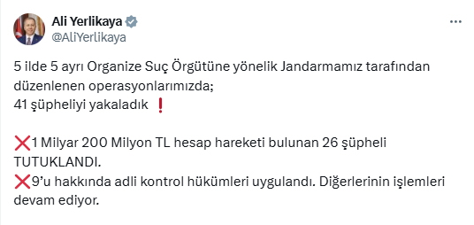 İçişleri Bakanı Ali Yerlikaya, jandarma tarafından düzenlenen suç örgütü operasyonunu sosyal medya hesabından paylaştı. Buna göre; Aydında baskı ve cebir uygulayarak işletmeleri haraca bağladıkları, Hakkaride yasa dışı bahis sitelerine reklam ve kullanıcı yönlendirmesi yaparak vatandaşları dolandırdıkları, Ankara ve Balıkesirde uyuşturucu ticareti yürüttükleri, Mersinde silah kaçakçılığı yaptıkları belirlenen 5 ayrı organize suç örgütüne yönelik 5 ilde düzenlenen operasyonda 41 şüpheli yakalandı. 1 milyar 200 milyon TL hesap hareketi bulunan 26 şüpheli tutuklandı, 9u hakkında adli kontrol kararı verildi. Diğerlerinin işlemleri devam ediyor.