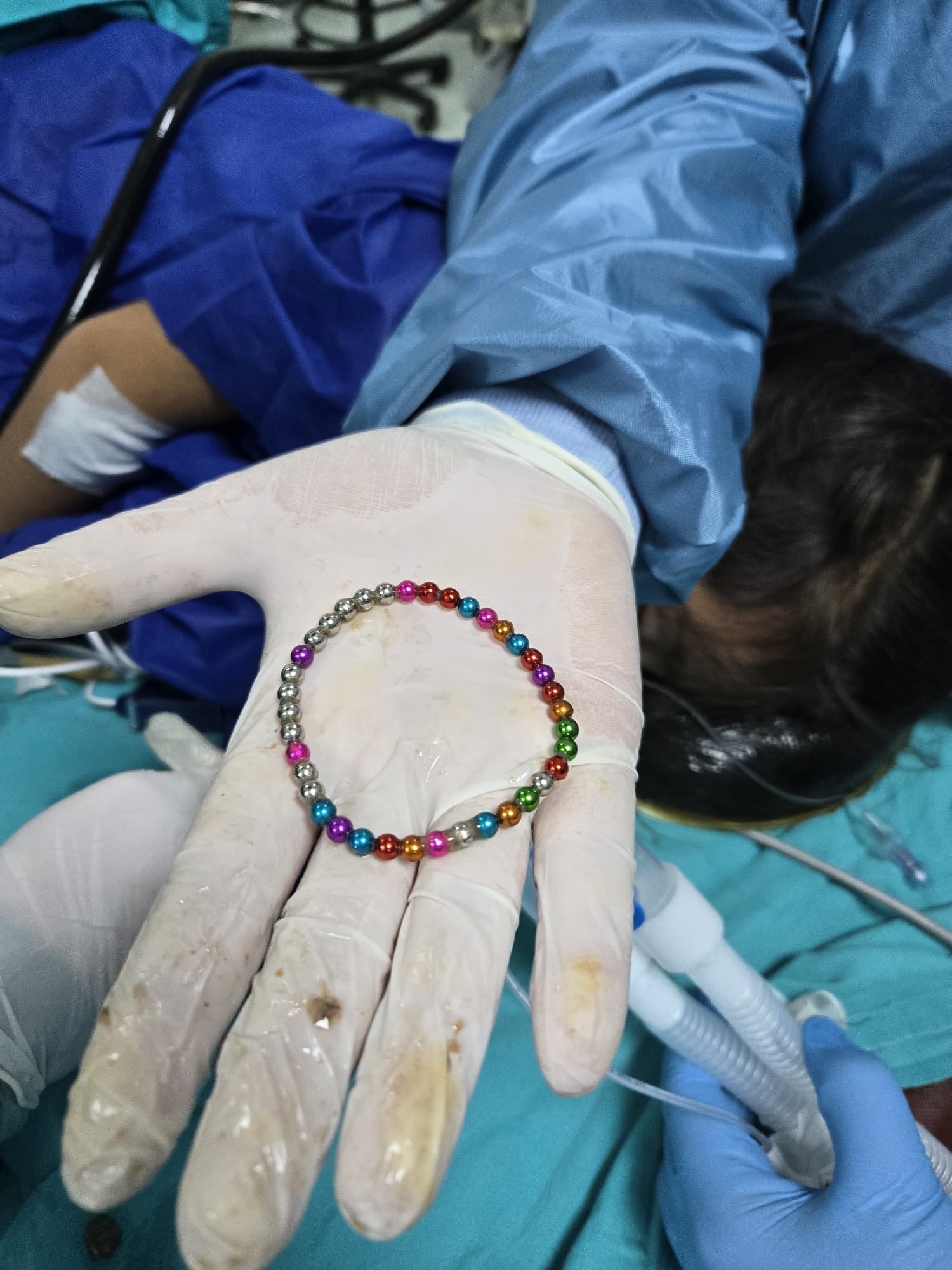 • Bursa'da, 5 yaşındaki E.E. isimli kız çocuğu, oyun oynadığı mıknatıslı boncuk bilekliği yuttu. Acil operasyona alınan çocuğun bağırsağından 38 adet mıknatıslı boncuk çıkarıldı. Fotoğraf: Bursa, (DHA)