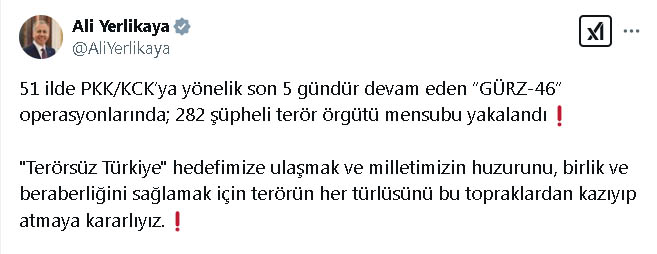 İçişleri Bakanı Ali Yerlikaya, sosyal medya hesabından yaptığı açıklamada, Cumhuriyet başsavcılıkları ile Emniyet Genel Müdürlüğü Terörle Mücadele Daire Başkanlığı ve İstihbarat Başkanlığı koordinasyonunda; 51 ilde PKK/KCKya yönelik son 5 gündür devam eden Gürz-46 operasyonlarında 282 şüpheli terör örgütü mensubunun yakalandığını belirtti. Operasyonlar sonucu 2 AK 47 tüfeği, 8 ruhsatsız av tüfeği, 5 ruhsatsız tabanca, 3 kurusıkı tabanca ve çok sayıda dijital materyalin ele geçirildiğini belirten Bakan Yerlikaya, “Şüphelilerin, PKK/KCK terör örgütünün siyasal alan, mali alan ve cezaevi yapılanmaları içerisinde faaliyet gösterdikleri, terör örgütüne finans sağladıkları, terör örgütüne eleman kazandırmaya aracılık ederek iş birlikçi faaliyetlerde bulundukları, örgüt yanlısı yasaklı yayın temin ettikleri, kanunsuz eylemler esnasında ve sonrasında şiddet içerikli sokak olaylarına katıldıkları, sosyal medya hesapları üzerinden terör örgütü propagandası yaptıkları ve haklarında kesinleşmiş hapis cezası ve aranma kaydı bulunduğu belirlendi” ifadelerini kullandı.