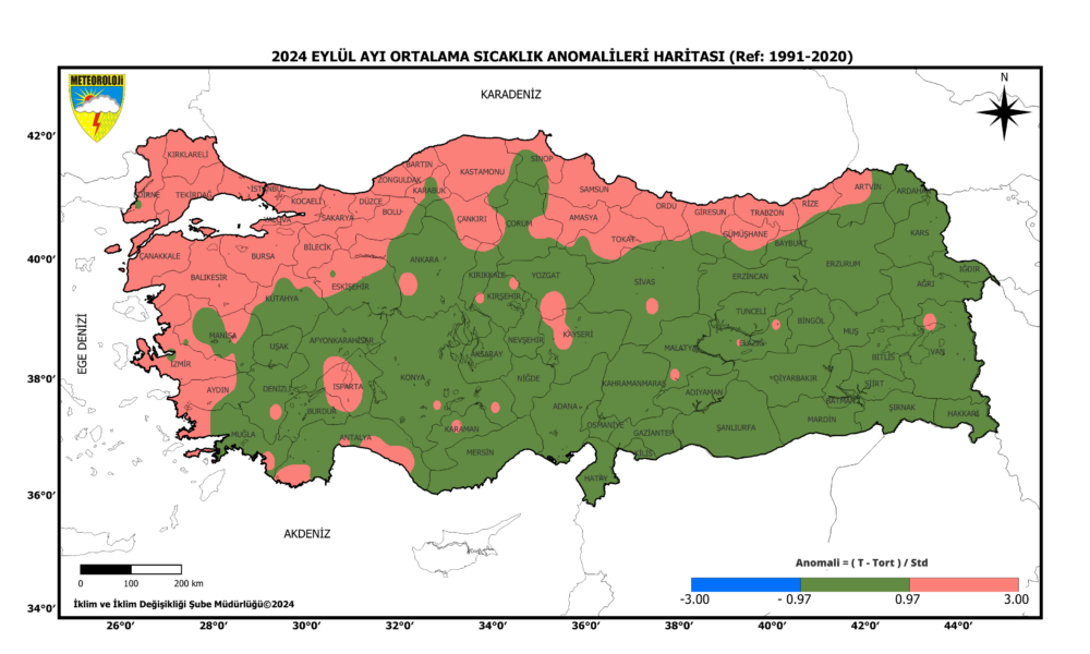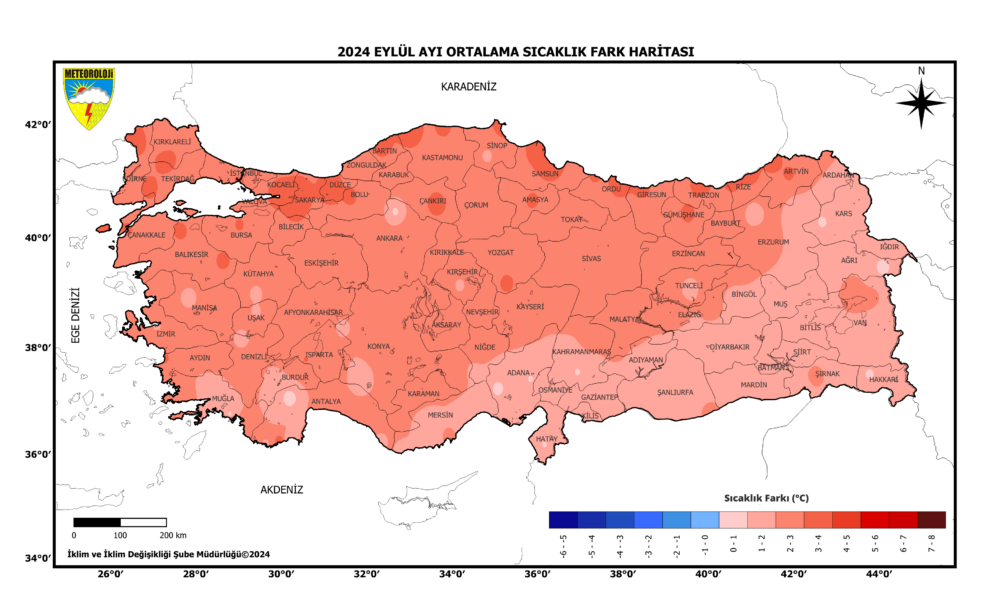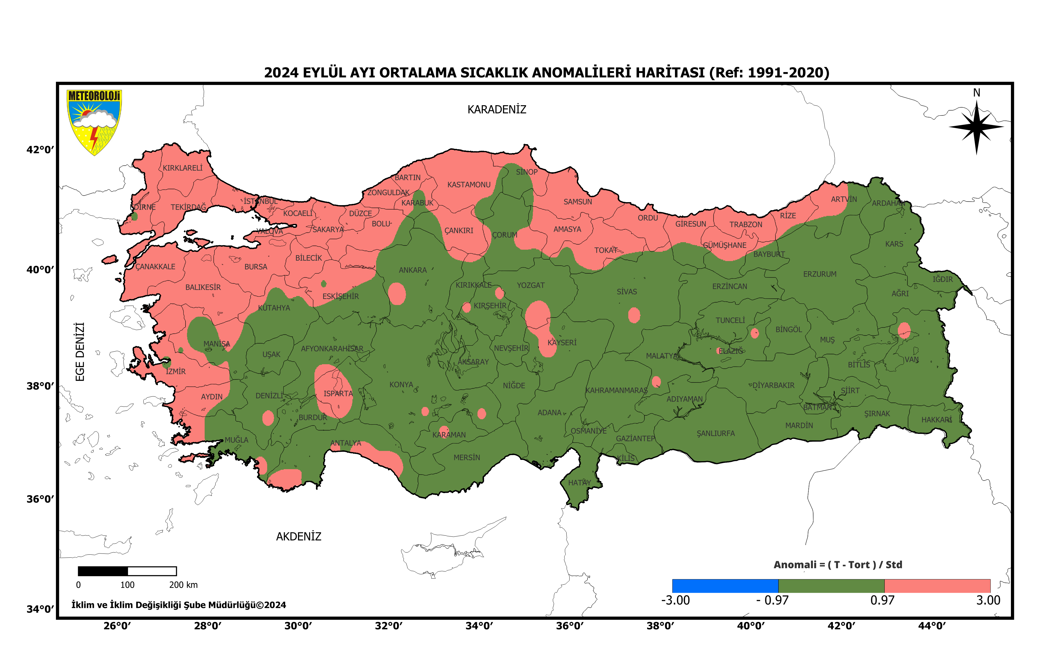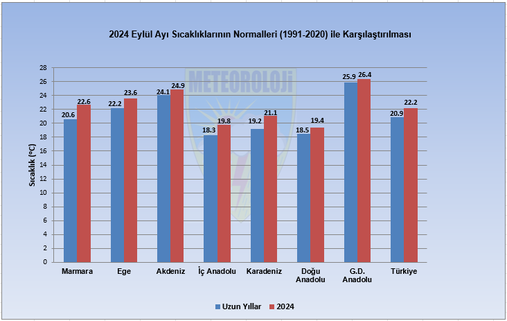 Meteoroloji Genel Müdürlüğü, 2024 yılı eylül ayı sıcaklık analizi raporunu yayımladı. Buna göre; 2024 yılı eylül ayında ortalama sıcaklıklar Ege ve Karadeniz bölgelerinin iç kesimlerinde, Doğu Anadolu, Güneydoğu Anadolu, Karadeniz ve İç Anadolu bölgelerinin hemen hemen tamamında mevsim normalleri civarında gerçekleşirken; yurdun diğer bölgelerinde mevsim normallerinin üzerinde gerçekleşti. 1991-2020 normalleri eylül ayı ortalama sıcaklığı 20,9 derece olurken, 2024 eylül ayı ortalama sıcaklığı 22,2 derece ile normalin 1,3 derece üzerinde gerçekleşti. Eylül, son 53 yılın en sıcak 7nci eylül ayı olarak kayıtlara geçti. Eylül ayında en düşük sıcaklık eksi 1,2 derece ile Karsın Sarıkamış ilçesi, en yüksek sıcaklık ise 44,3 derece ile Şırnakın Cizre ilçesinde tespit edildi.