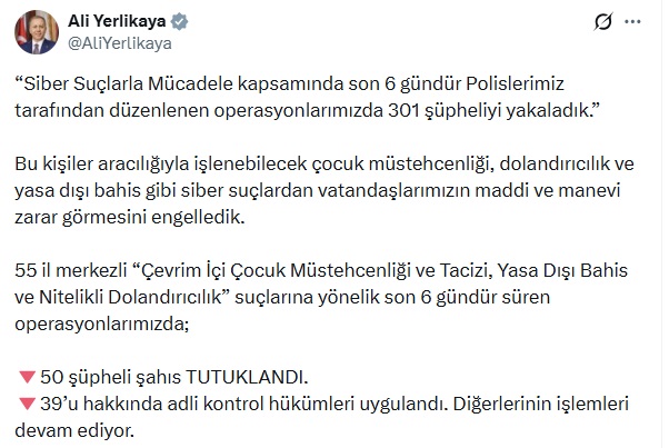 İçişleri Bakanı Ali Yerlikaya, polis tarafından düzenlenen operasyonları sosyal medya hesabından duyurdu. Buna göre; 55 il merkezli Çevrim içi çocuk müstehcenliği ve tacizi, Yasa dışı bahis ve Nitelikli dolandırıcılık suçlarına yönelik son 6 gündür süren operasyonlarda 301 şüpheli yakalandı. Şüphelilerden 50si tutuklanırken, 39’u hakkında adli kontrol hükümleri uygulandı, diğerlerinin işlemleri devam ediyor. Şüphelilerin; müstehcen çocuk görüntüsü barındırdıkları, sosyal medya platformları ve oltalama (phishing) siteleri üzerinden yatırım danışmanlığı, ürün satışı, sosyal yardım, düşük faizli kredi temalarını kullanarak vatandaşları dolandırdıkları, kişisel verilerin paylaşımı ve sorgulama konularında paylaşımlar yaptıkları, yasa dışı bahis ve kumar oynattıkları, yasa dışı bahis sitelerinde para nakline aracılık ettikleri, reklamını yaptıkları tespit edildi.