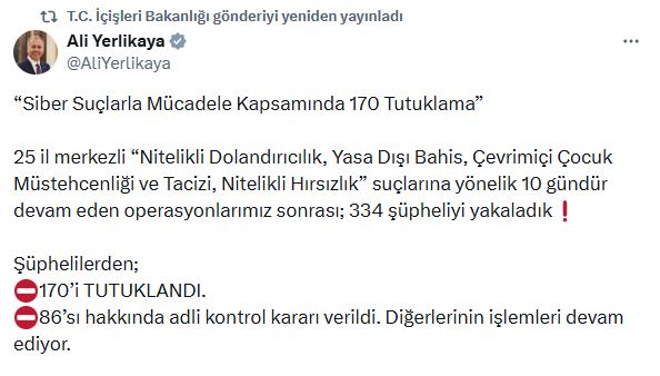 İçişleri Bakanı Yerlikayanın sosyal medya hesabından yaptığı açıklamaya göre; 25 il merkezli toplam 58 ilde son 10 günde siber suçlarla mücadele operasyonları düzenlendi. Polis ekipleri tarafından yürütülen operasyonlarda 334 şüpheli yakalandı, ruhsatsız tabancalar ile çok sayıda dijital materyal ele geçirildi. İşlemleri tamamlanan şüphelilerden 170i tutuklandı, 86sı hakkında adli kontrol kararı verildi. Diğerlerinin işlemleri devam ediyor.