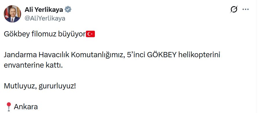 Bakan Ali Yerlikaya, sanal medya hesabından yaptığı açıklamada, “Gökbey filomuz büyüyor. Jandarma Havacılık Komutanlığımız, 5inci Gökbey helikopterini envanterine kattı. Mutluyuz, gururluyuz” dedi.