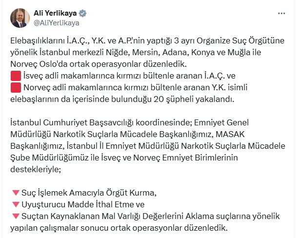 İçişleri Bakanı Ali Yerlikaya, organize suç örgütlerine yönelik Emniyet Genel Müdürlüğü koordinesinde düzenlenen operasyonu sosyal medya hesabından paylaştı. Buna göre; İsveç ve Norveç emniyet birimlerinin destekleriyle; elebaşılıklarını İ.A.Ç., Y.K. ve A.P.nin yaptığı 3 ayrı organize suç örgütüne yönelik İstanbul merkezli Niğde, Mersin, Adana, Konya ve Muğla ile Norveç Osloda ortak operasyonlar düzenlendi. İsveç adli makamlarınca kırmızı bültenle aranan İ.A.Ç. ve Norveç adli makamlarınca kırmızı bültenle aranan Y.K. isimli elebaşlarının da içerisinde bulunduğu 20 şüpheli yakalandı. 3 suç örgütüne ait 1 ton 540 kilogram uyuşturucu madde yurt dışında ortak çalışma ile ele geçirildi. MASAK raporlarına istinaden şüphelilere ait; 53 taşınmaz, 27 araç, 15 şirket ve şirket ortaklığı tespit edilerek yaklaşık 1,5 milyar TL değerindeki mal varlığına el konuldu.