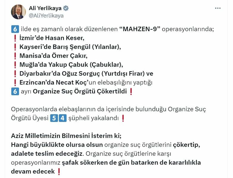 İÇİŞLERİ Bakanı Ali Yerlikaya, 6 ilde eş zamanlı düzenlenen Mahzen-9 operasyonlarında 6 ayrı organize suç örgütünün çökertildiğini ve 54 şüphelinin yakalandığını duyurdu.Bakan Yerlikaya, sosyal medya hesabından yaptığı açıklamada İzmir, Kayseri, Manisa, Muğla, Diyarbakır ve Erzincanda polis ekiplerinin çalışması sonucu, organize suç örgütü üyesi şüphelilerin suç işlemek amacıyla örgüt kurmak, nitelikli yağma, uyuşturucu madde imal ve ticareti, kasten yaralama, ölümle tehdit, kişiyi hürriyetinden yoksun kılma, genel güvenliğin kasten tehlikeye sokulması, tefecilik, çek ve senet tahsilatı, şantaj, fuhşa teşvik, silah ve mühimmat kaçakçılığı suçlarını işlediklerinin tespit edildiğini belirtti. Yerlikaya, “6 ilde eş zamanlı olarak düzenlenen Mahzen-9 operasyonlarında; İzmirde Hasan Keser, Kayseride Barış Şengül (Yılanlar), Manisada Ömer Çakır, Muğlada Yakup Çabuk (Çabuklar), Diyarbakırda Oğuz Sorguç (Yurt Dışı Firar) ve Erzincanda Necat Koçun elebaşılığını yaptığı 6 ayrı organize suç örgütü çökertildi. Operasyonlarda elebaşlarının da içerisinde bulunduğu organize suç örgütü üyesi 54 şüpheli yakalandı. Aziz milletimizin bilmesini isterim ki hangi büyüklükte olursa olsun organize suç örgütlerini çökertip, adalete teslim edeceğiz. Organize suç örgütlerine karşı operasyonlarımız şafak sökerken de gün batarken de kararlılıkla devam edecek” dedi.